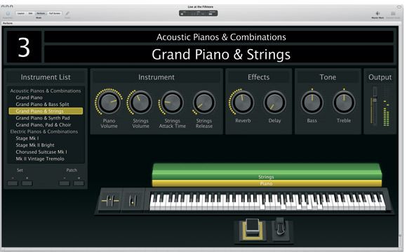 MainStage is not only an amazing host for software instruments and effects, it’s also packed with innovations that let you shine on stage. For starters, there’s the Floating Split Point. It intelligently moves the split point on a split keyboard Patch to respond to what you’re playing. Start walking a bass line up the keyboard, and the split point moves up so the bass doesn’t suddenly become some other sound when you get into the higher notes.