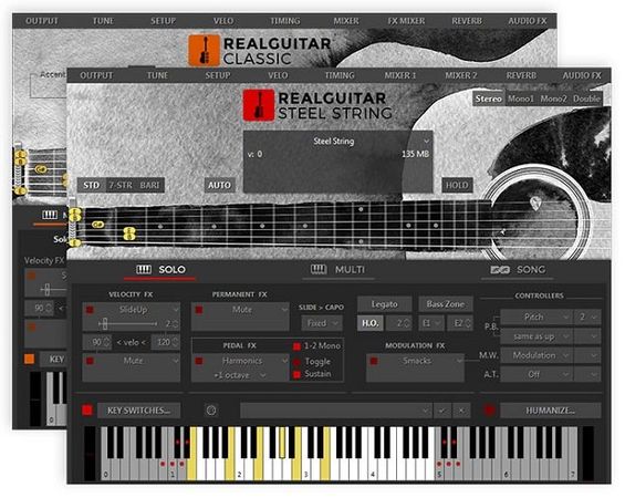 If you are serious about creating truly realistic sounding solo and accompaniment guitar stuff for your songs, our product called RealGuitar is just what you need. RealGuitar is a sample-based virtual instrument with an innovative approach to guitar sound modeling and guitar part performing on keyboard.