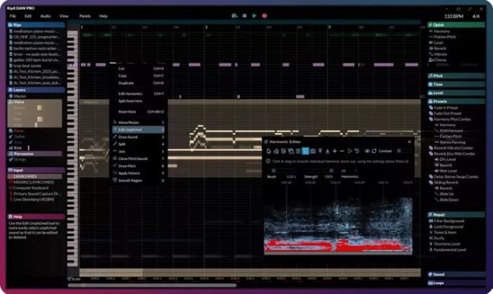 RipX DAW PRO adds the award-winning Audioshop tools and Harmonic Editor for the most precise audio editing available to create an AI DAW with unlimited capabilities. Two further panels are also included: Repair for quickly cleaning up audio non-destructively; and RipScripts for writing custom tools