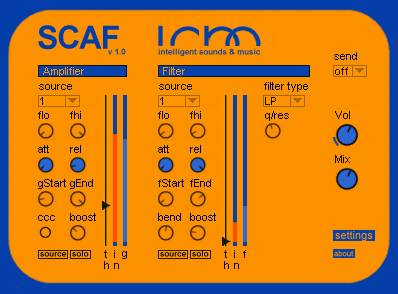 SCAF consists of a filter and an amplifier section. Both can be controlled by any track in your project. The routing between the tracks is done via internal host-independent side chains.